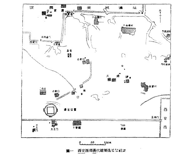 遗址位于现西安市郊的西北部,东距玉祥门约1.5公里,北距汉代长安城故址约1公里余,南邻大也也(图一)。遗址在未发掘之前,地势略高于其周围的一般地面,中部是一个不规则的大土堆,其南北长180,东西宽约60余米,中部最高处约5—7来,当地的人们把它叫做"冢屹幡''(图版壹,1)。