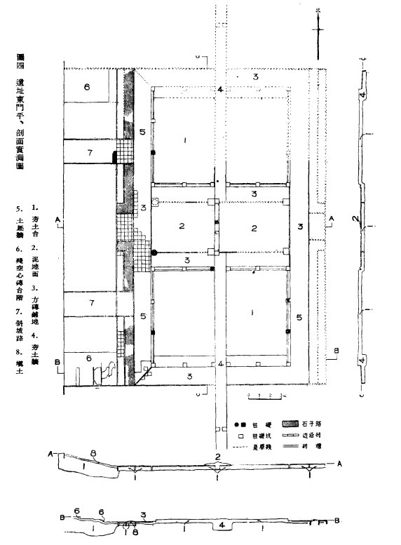 中心建筑是在一个方形的土台正中部。土台南北长205,东西长206,高1.6米。土台的上部是夯±o中心建筑物的地基是一个圆形夯土台。夯土台的上部直径62,底径60米。地基高于院落地面30多厘米。其构造是,在所要建筑的地点及所需要的面积处,先掘一个圆坑,坑壁略成弧形,经硬实后,再在坑内塡土,夯筑成一个圆台基,再按照平面的布局挖出室内的空间,留出墙壁,再挖柱窝。从居住面至夯土底深为2.9米。中心建筑的平面似“亚"字形。方向正南北,南北通长42,东西42.4来。正中是个大方形的夯土台,南北长16.8,东西长17.4,残高1.5米。按其四周建筑的布置,夯土台原来很高,推测高台上面原有楼阁式的建筑。在土台的四角,各有方形的小夯土台两个,大小相同。这些小土台可能是帮助建筑物在转角地方角柱加固而筑成的,也可能上面原有小楼或亭阁的建筑。在大夯土台的四周有东、南、西、北四堂建筑(图三;图版壹,2)。北堂出抱厦四间,其他三堂毎面出抱厦八间,每边通长24米。在抱厦、厅堂以及廊屋转角处都用两个柱础(图版捌,2),如果两个转角相邻处则用四个(图版捌,1),其中只有一个转角是用一个大柱础的,但它的大小却相当于两个小柱础。这种在转角处使用两个柱础的作法,是受到当时的科学技术水平的限制,在建筑上还不能解决转角的复杂结构。南北两堂柱础都用白石,石质细腻;东西两堂则用靑石,质粗而体积也较小。