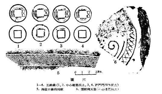 分板瓦筒瓦两种。板瓦表面有斜绳纹,里素面,厚1.7—2.3,宽49厘米。筒瓦表面有直绳纹,纹印细而深,里面有粗布纹,长51—56,宽16.5—18.5,厚1.5—2.1厘米。瓦的大小厚薄均不一样。瓦当出土38个,圆形,素面,直径18.7—19.5,厚2.8—3厘米。大瓦当出于大门内,小瓦当出于配房。中心建筑内只出一块残云纹瓦当(图六,6),和残陶盆口沿数片,上面有回纹(图六,5)。
