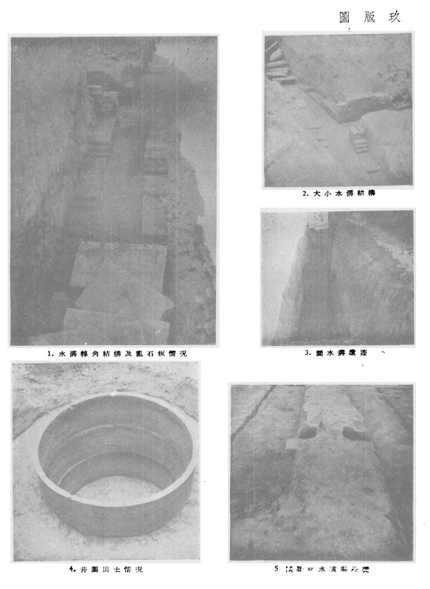 在配房斜坡上的东南角院内,淸理出箧代水井一座,井口深0.4,井口至底5.8米,井作圆形,直径1.38米。井内上部塡土为灰褐色,厚1.1米,其下为黄褐色土,底部为一种黄泥夹沙的淤土。里面出土有灰色陶罐、残筒瓦,筒瓦与遗址内出土的一样。井底部系用陶制圆形井圈二个重叠砌成,每个圈直径1.2,高0.34,厚0.04米,表面有绳纹,里面有豆点纹(图版玖,4)。