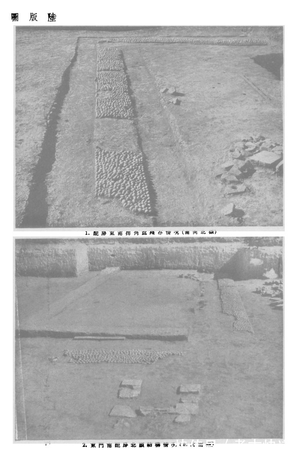 在围墙的外面有圜水沟。沟相距东西两门56.5,南门54,北门43来。沟为圆形,其直径东西368,南北349米。水沟与四个门相对处又各围有一个长方形的小水沟,北边的小水沟与一条宽21,深3.8米的由西向东的河渠相通,圜水沟的流水出入于该河渠。其余三个小水沟与大圜水沟相通。东西两小水沟长90,距大圜水沟27米,南北小水沟长72米o地表面至沟的口部深1.5,沟口至底深1.8,沟的两土壁宽1.8—2米。沟用长方砖垒砌,从残存的砖面看,是最下部分为三层顺砌,丁头外露,以上各层顺砌,不露丁头。砖素面,长37.5,宽18,厚9.2厘米。砌砖两壁构成沟的内宽为92厘米。在四个大门相对的小水沟内的乱砖上,乱堆置着石板。石板为靑石作成,甚粗糙,长1.08,宽0.63,厚0.12厘米,一边有裁口缝,缝的边宽2.5厘米。根据出土位置推测,石板原系盖在水沟上面的(图版玖,1—3)